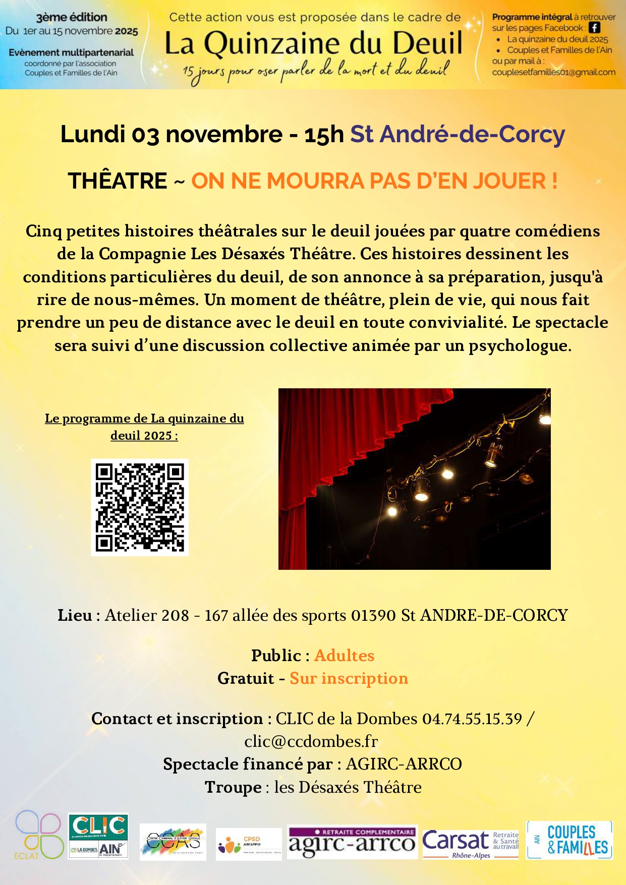 Dans le cadre de la quinzaine du deuil, organisée par l’association Couples et Familles de l’Ain, le CLIC de la Dombes et la Cellule de prévention vous invitent à un temps fort à la fois sensible et plein de vie :