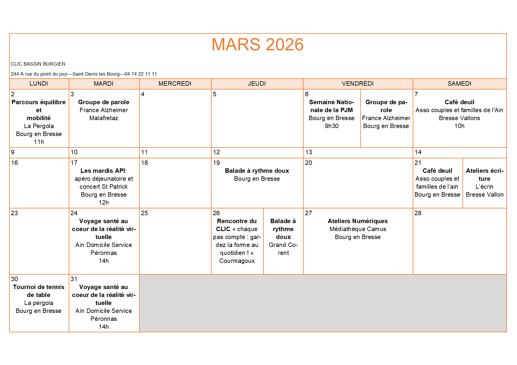 Retrouvez ici le calendrier des actions de prévention organisées sur le secteur du CLIC !